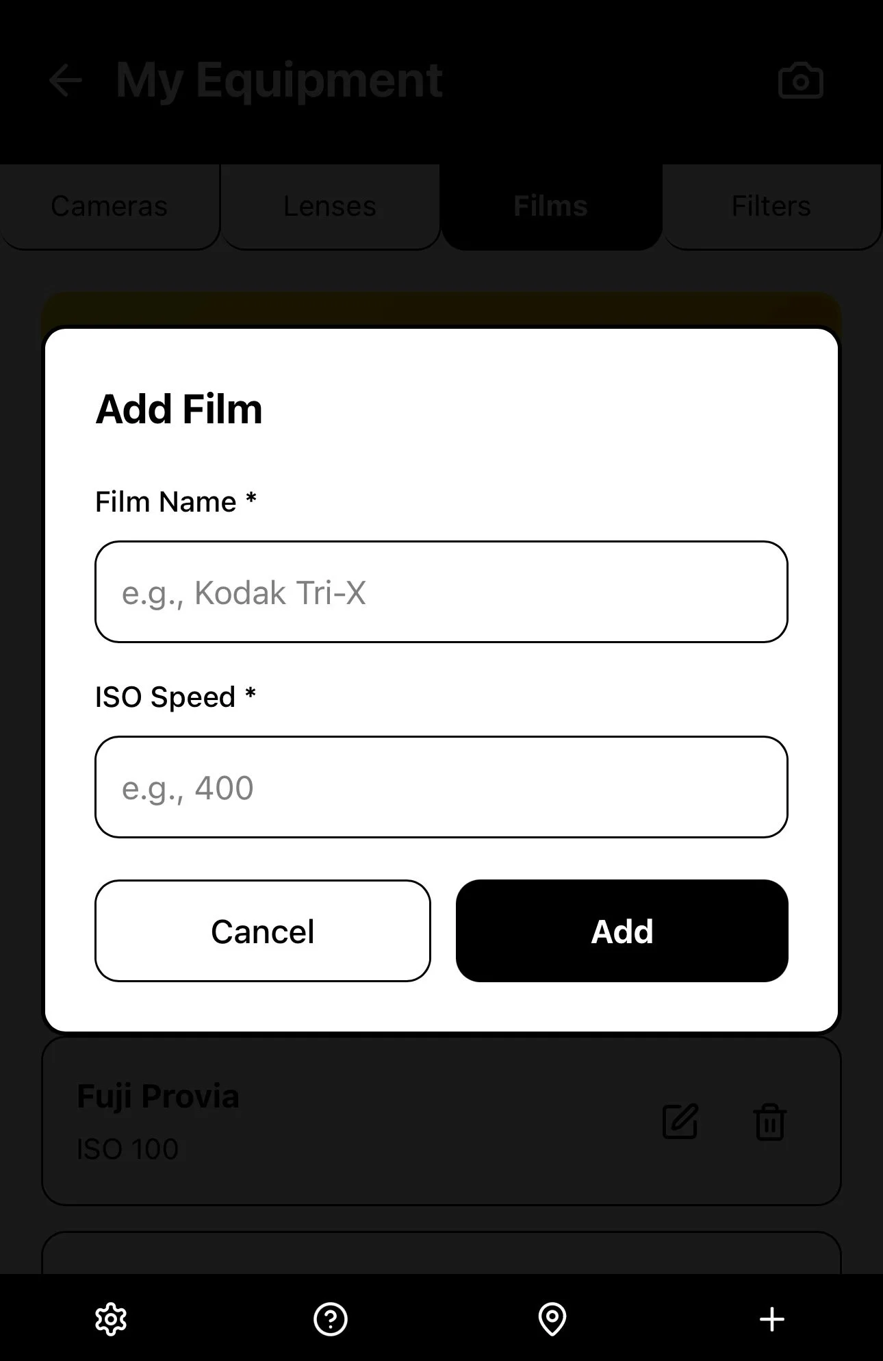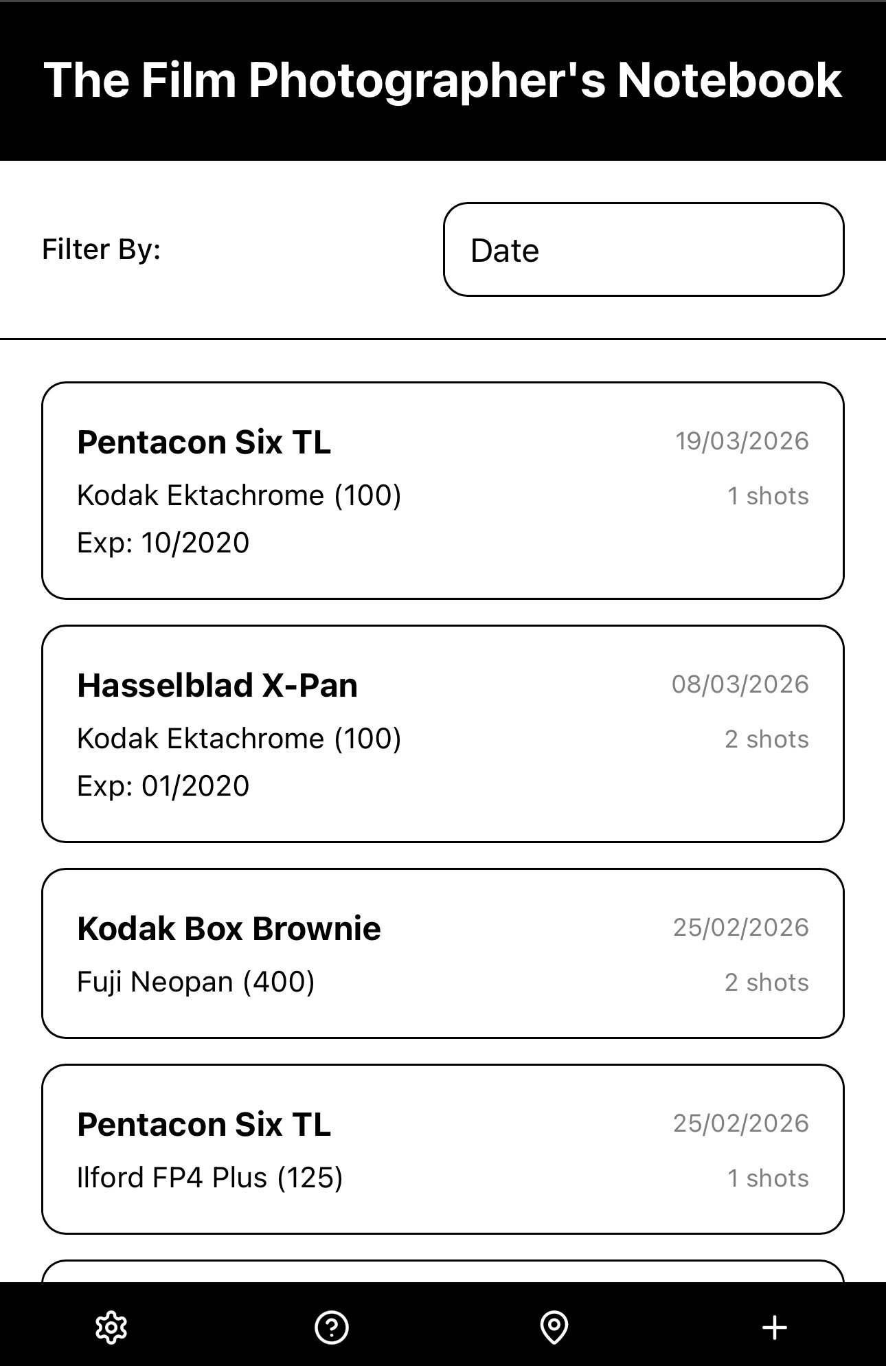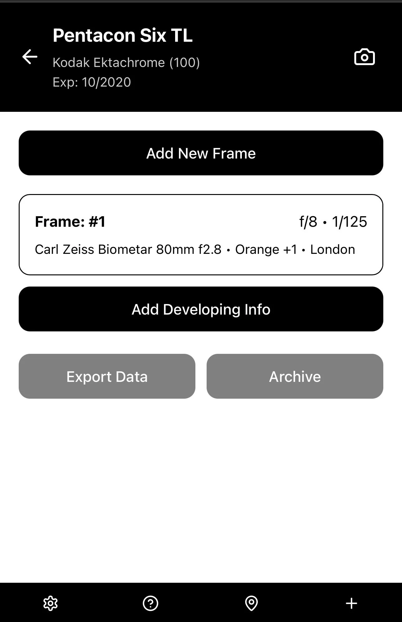 Once you’ve added all the information about the camera equipment and film types you use, you are ready to create a New Roll by selecting the + icon in the bottom menu bar.