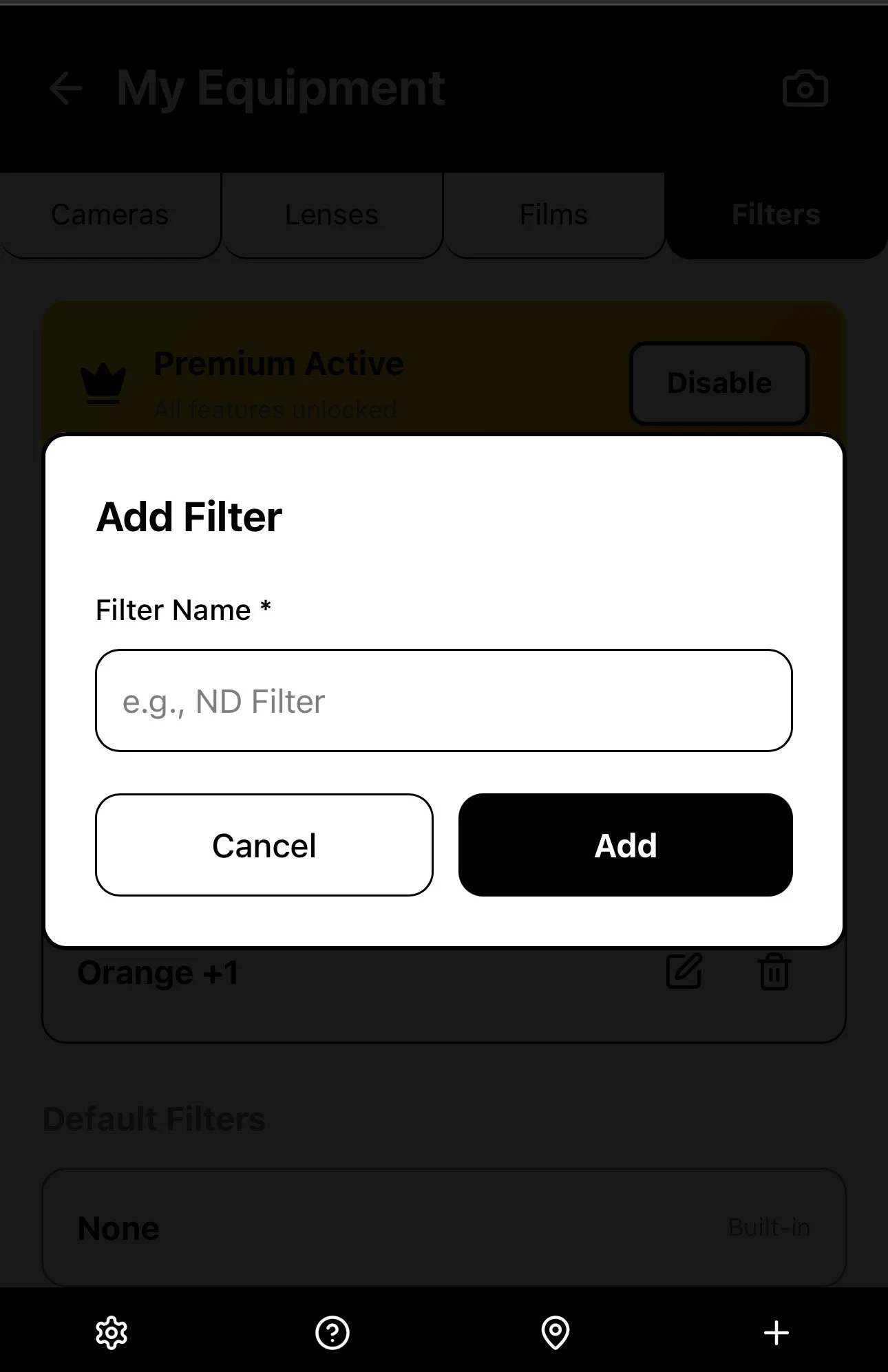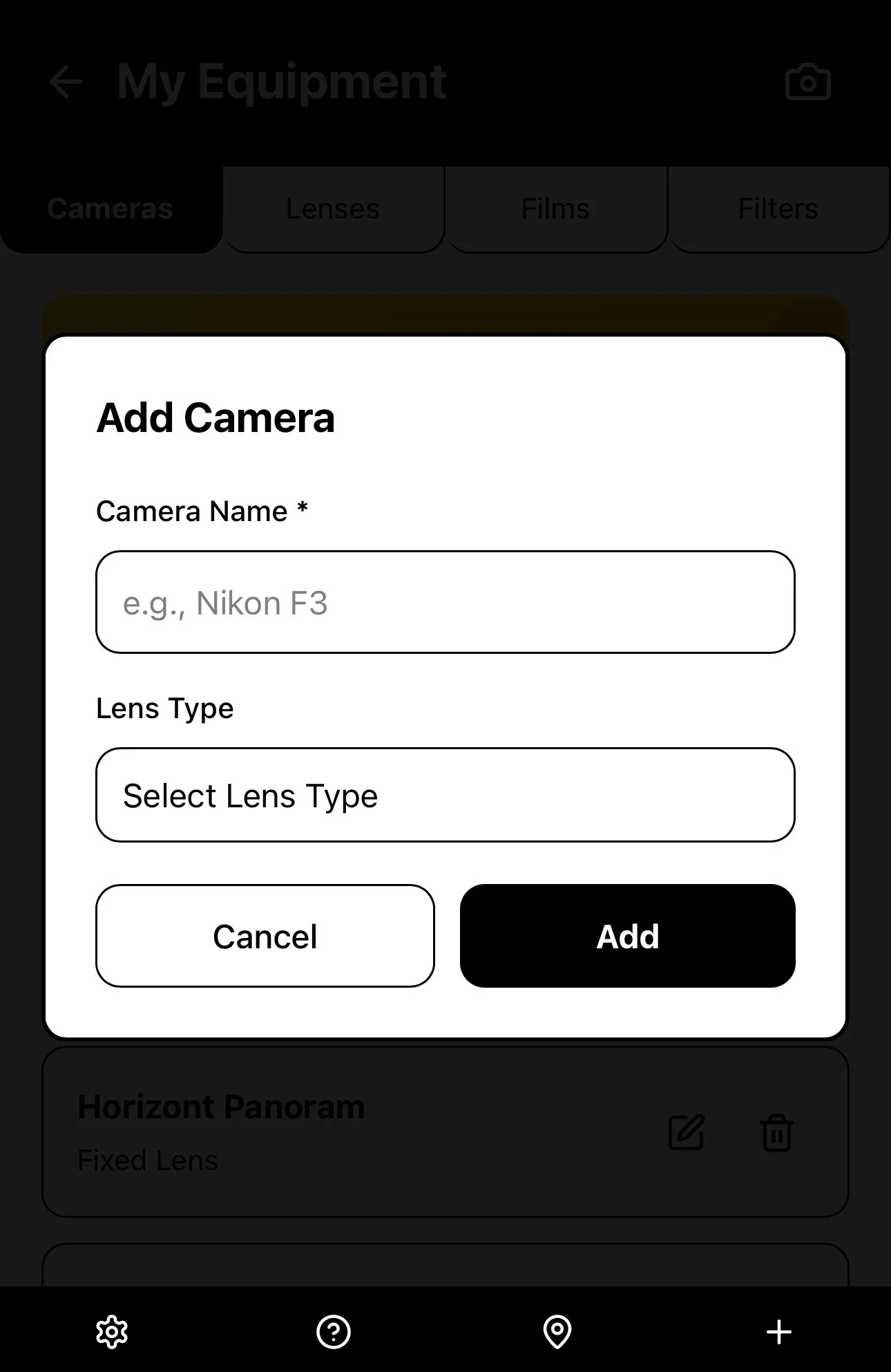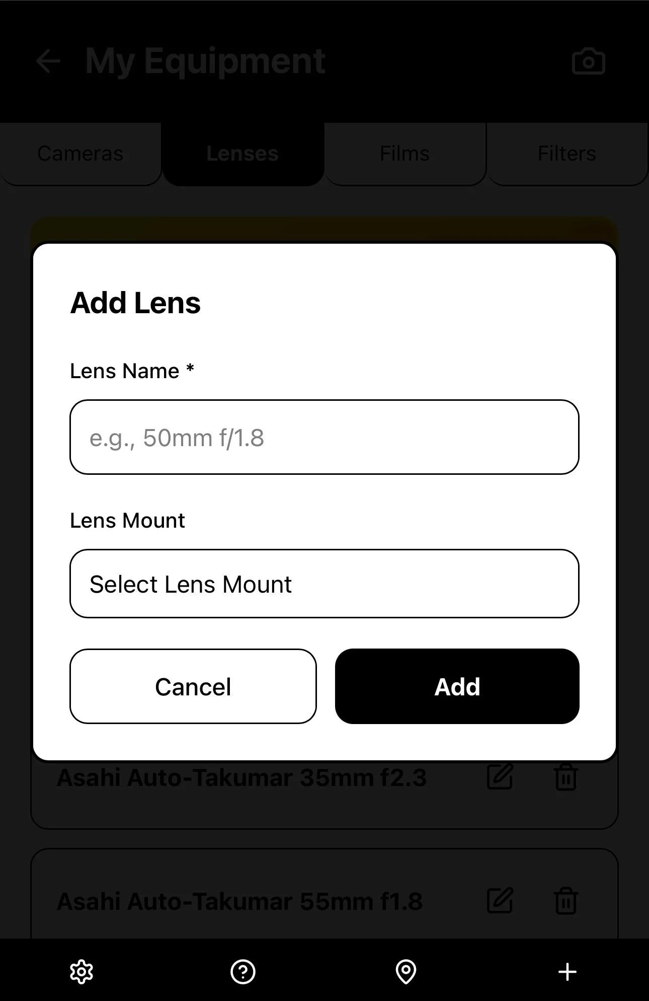 Once you’ve added all the information about the camera equipment and film types you use, you are ready to create a New Roll by selecting the + icon in the bottom menu bar.