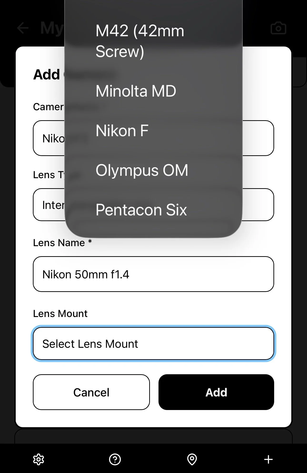 If you are adding an Interchangeable Lens Camera, you will first need to choose a mount type for that camera, e.g. Canon EF or M42 Screw Mount. A list of all lenses with that mount will be shown in the drop-down menu. You can choose an existing lens, or you can add a new lens. This will be the default Lens whenever you select this Camera for a Roll of film.