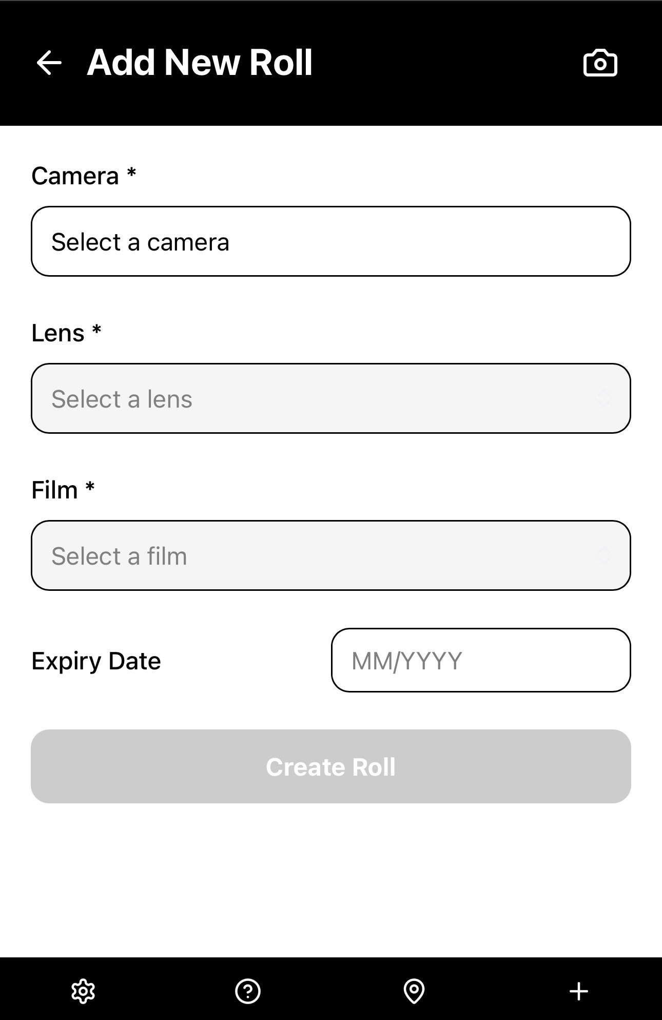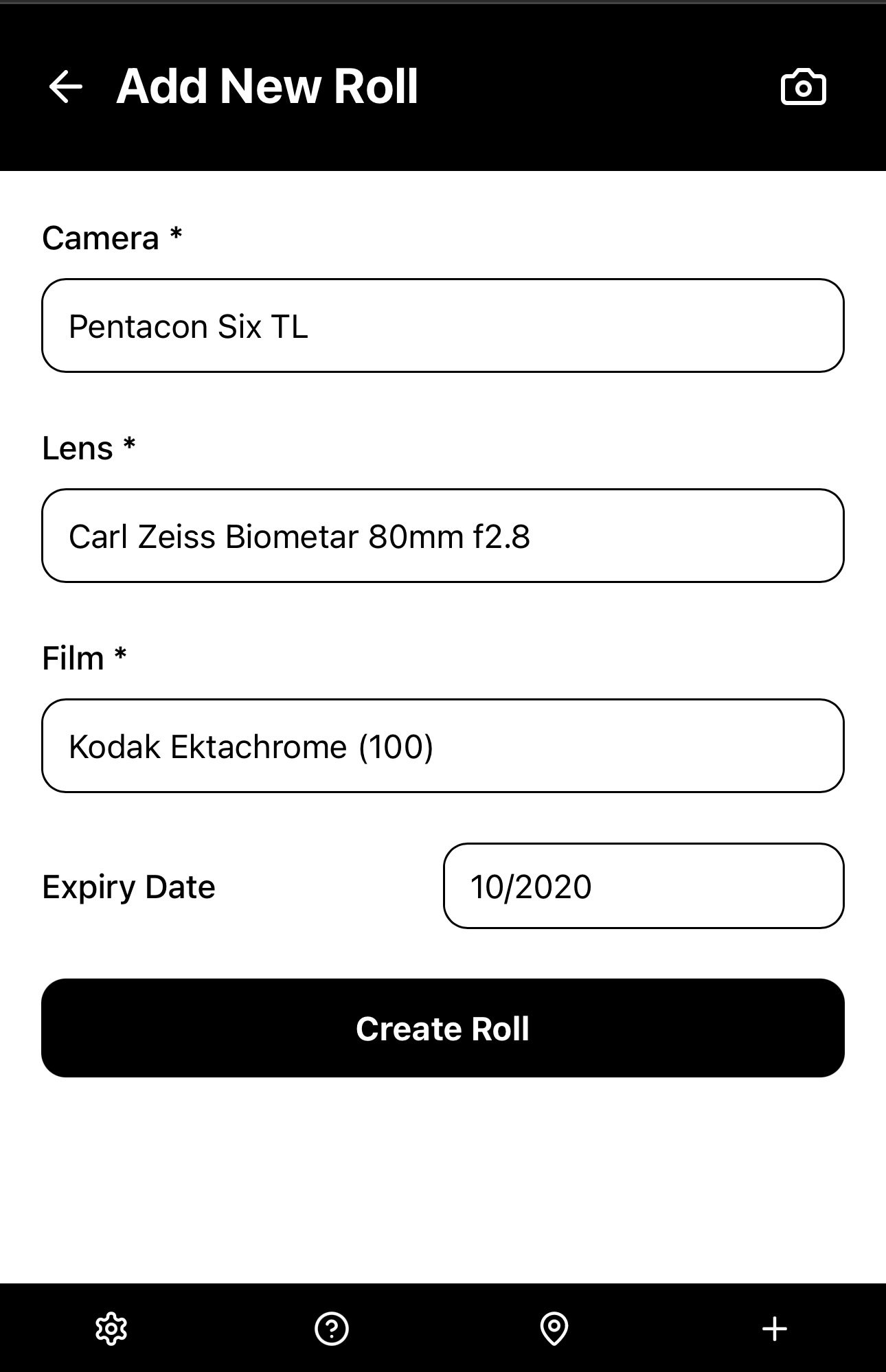 In the New Roll page, select a Camera, select a Lens if it is an Interchangeable Lens camera, choose a Film stock and add its expiry date (optional), then select “Create Roll”.