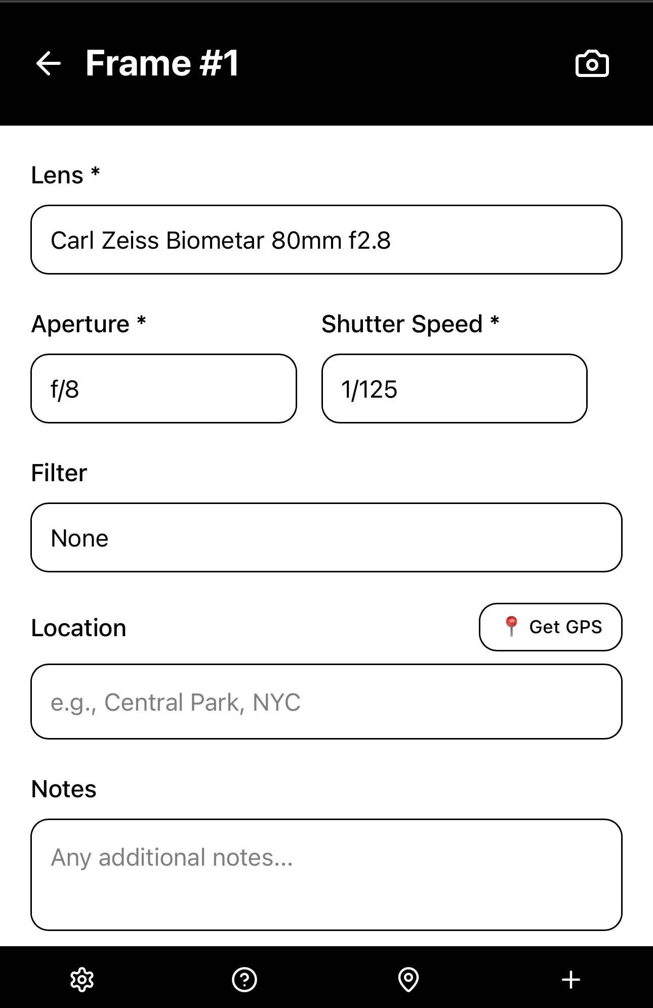 Once you have created a New Roll, you can now enter the exposure data frame by frame, including Lens (only for Interchangeable Lens cameras), Aperture, Shutter Speed, and Filters.