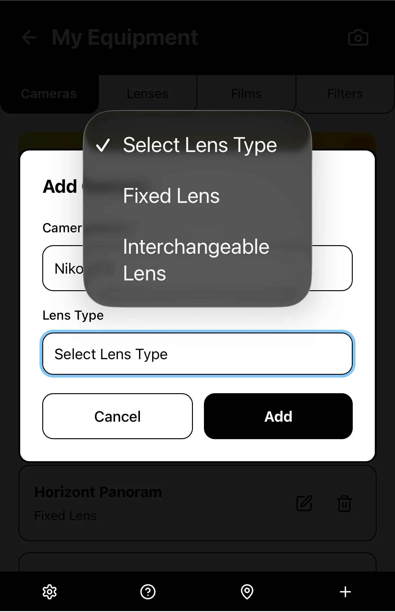 It is important to categorise your Cameras as either Fixed Lens cameras or Interchangeable Lens cameras, in order to maintain the correct data throughout the app.